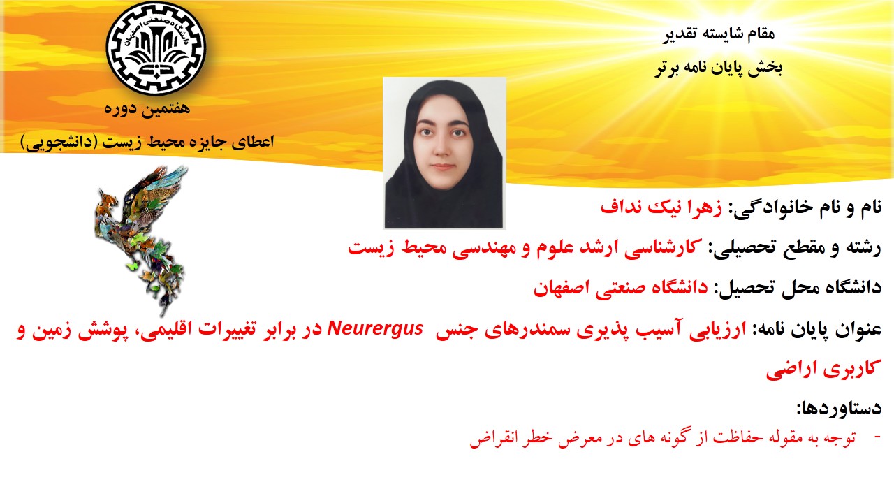 همچنن از تلاش محمد محمدنژاد، دانشجوی کارشناسی ارشد مدیریت شهری از دانشگاه ارومیه برای حفاظت از گونه های در معرض خطر انقراض مانند میشمرغ، پرندهای که در فهرست سرخ اتحادیه بینالمللی حفاظت از طبیعت قرار دارد ، در بخش دانشجویان فعال محیط زیستی در زمینه حفاظت از گونه های در معرض خطر انقراض ، تقدیر به عمل آمد.