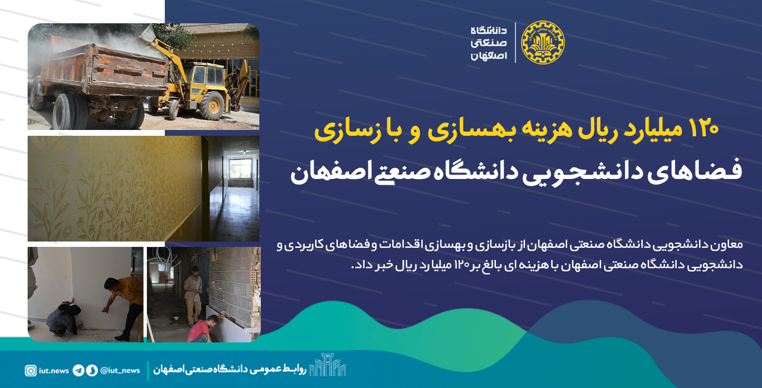 معاون دانشجویی دانشگاه صنعتی اصفهان از بازسازی و بهسازی اقدامات و فضاهای کاربردی و دانشجویی دانشگاه صنعتی اصفهان با هزینه ای بالغ بر 120 میلیارد ریال خبر داد.