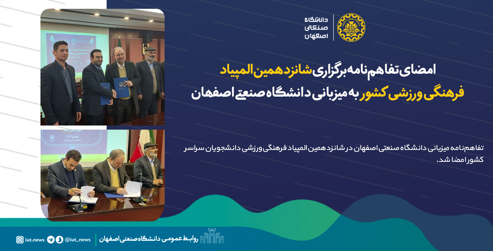 به گزارش روابط عمومی دانشگاه صنعتی اصفهان، مراسم امضای تفاهمنامه برگزاری شانزدهمین المپیاد فرهنگی ورزشی دانشجویان سراسر کشور میان دکتر داداشپور، رئیس سازمان امور دانشجویان و دکتر مجتبی بابایی خورزوقی، معاون دانشجویی دانشگاه صنعتی اصفهان برگزار شد.