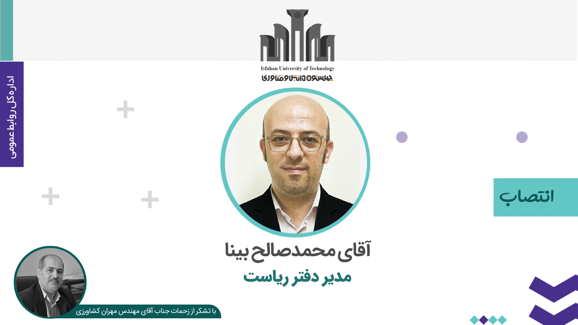 با حکم سرپرست دانشگاه صنعتی اصفهان، جناب آقای محمد صالح بینا به سمت مدیر دفتر ریاست دانشگاه منصوب شد.